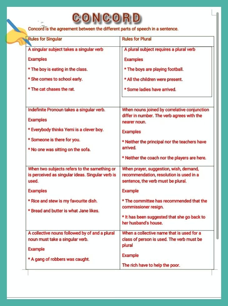 Concord, also known as subject-verb agreement, is a crucial aspect of grammar that ensures that subjects and verbs in a sentence agree in number. This agreement helps to maintain clarity and coherence in writing. Here are 10 rules of concord with examples to help you master this important aspect of grammar:
