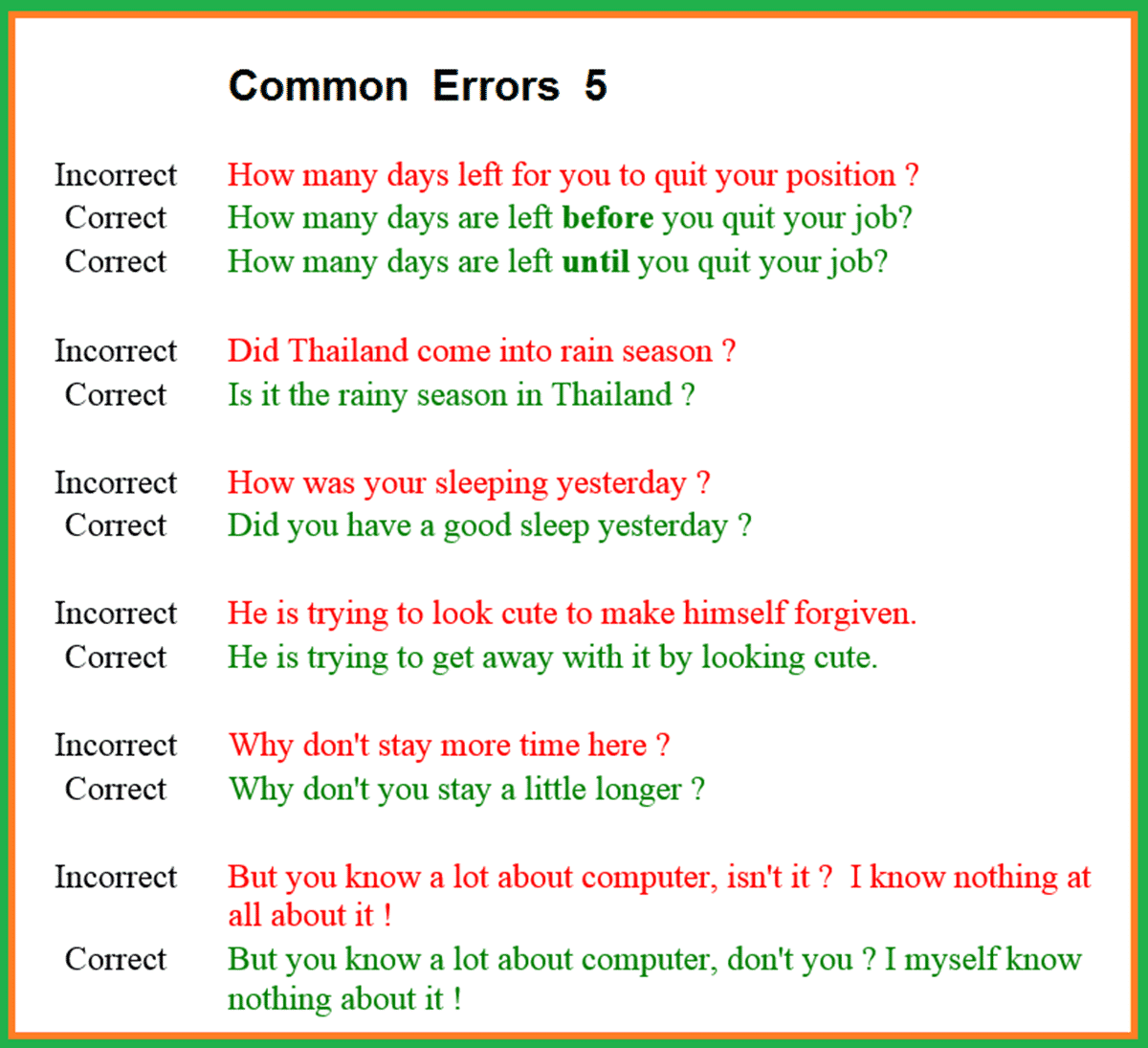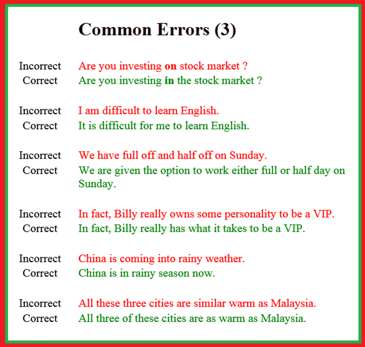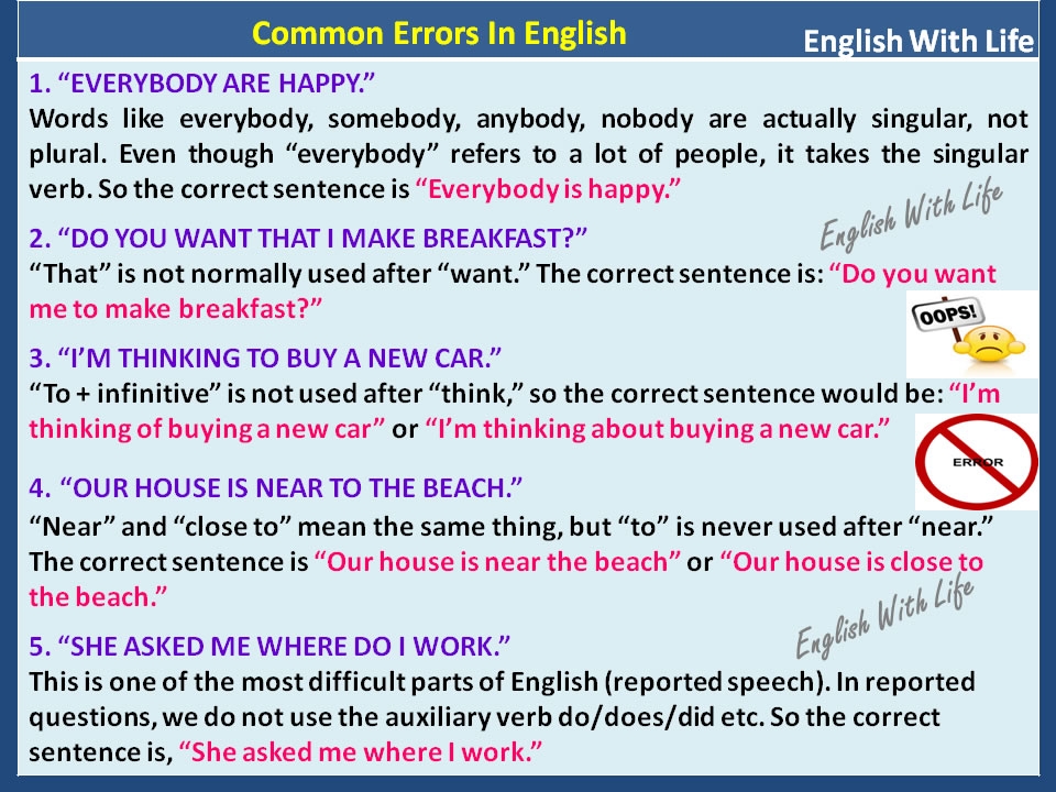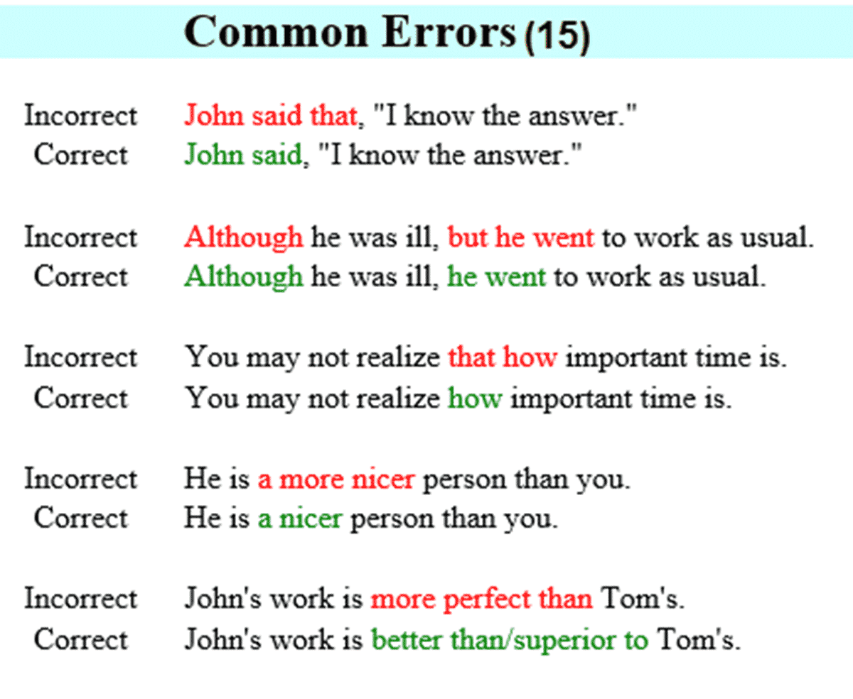 These are just a few of the many errors that people make in English. It’s important to pay attention to these common mistakes and try to avoid them in your writing and speaking.