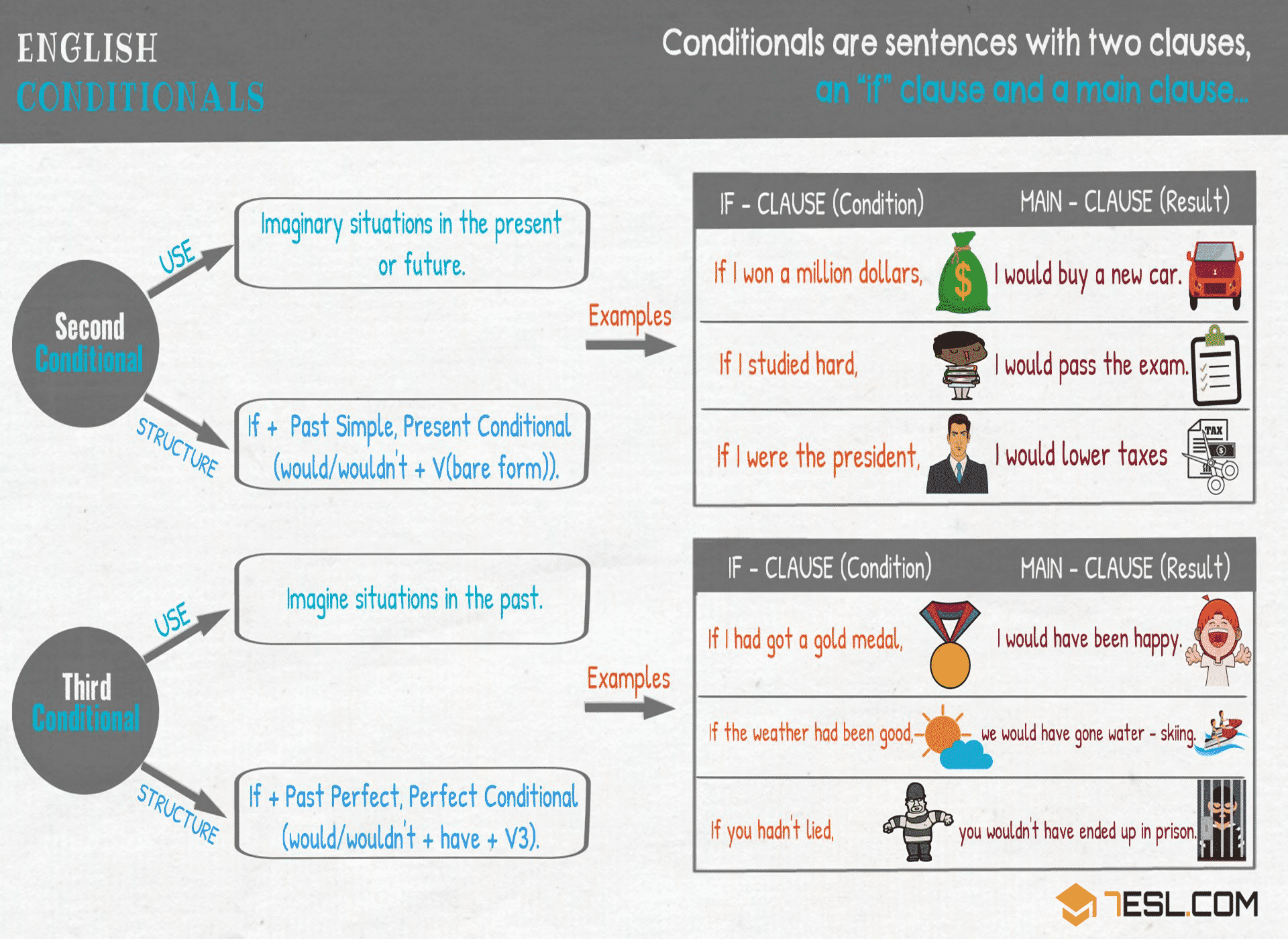 In English grammar, the second conditional is used to talk about imaginary or hypothetical situations and their probable results. It is formed by using the past simple tense in the if-clause and the modal verb would + base form of the verb in the main clause.