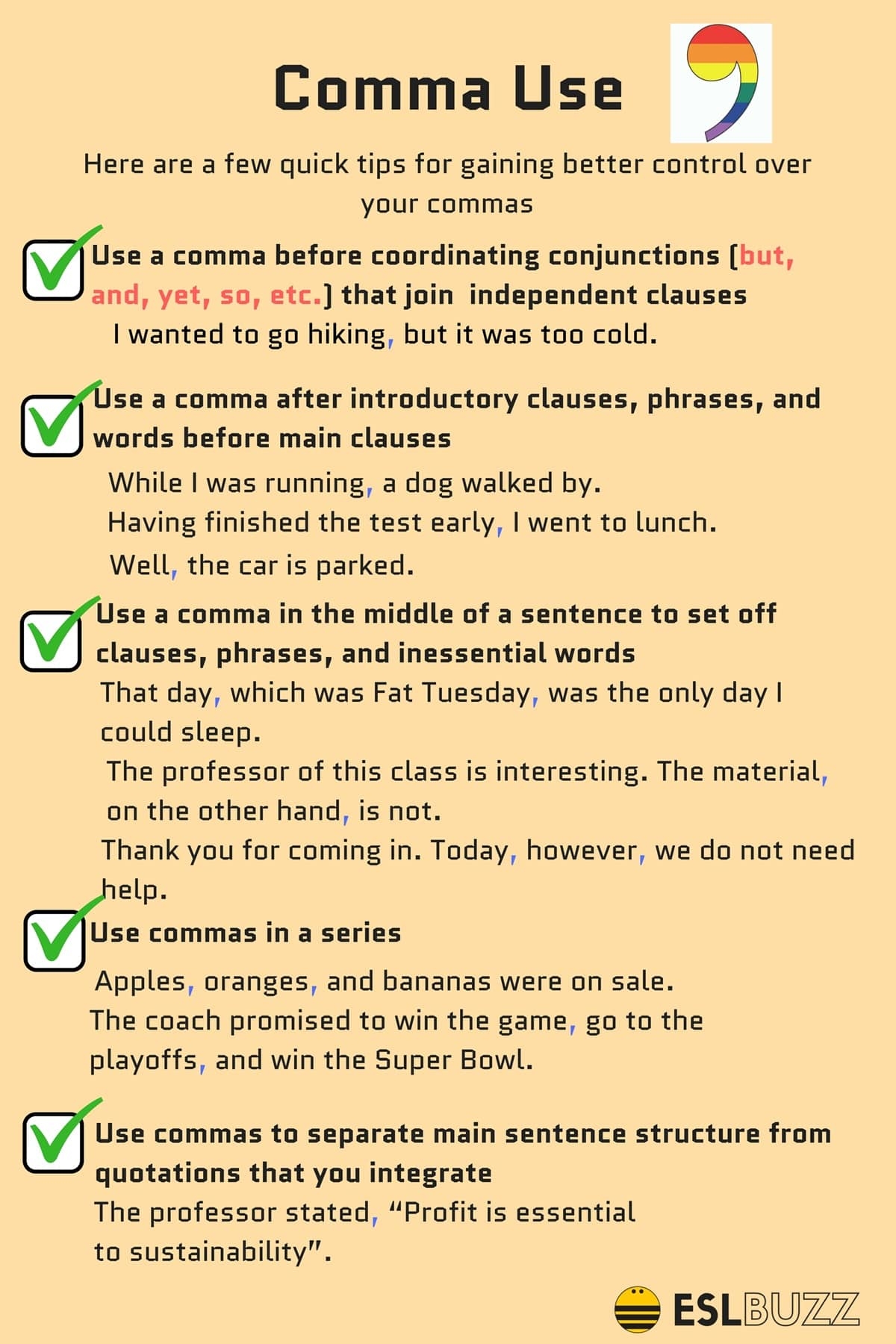 Commas are a vital punctuation mark in the English language that help to clarify meaning, separate items in a list, and indicate pauses in a sentence. Understanding the rules of comma usage can greatly enhance your writing and improve clarity for the reader.