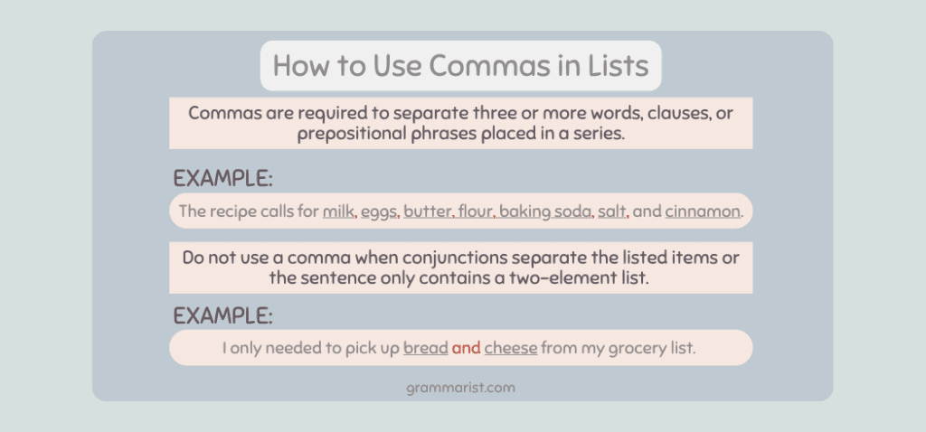 When listing three or more items in a sentence, use commas to separate them. For example: “I need to buy apples, oranges, and bananas at the store.” This helps to clearly distinguish each item in the list.