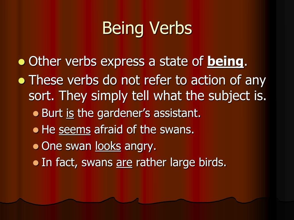 Being verbs include “am,” “is,” “are,” “was,” “were,” “be,” “being,” and “been.” These verbs do not show action but instead link the subject to a description. For example, in the sentence “She is happy,” the being verb “is” connects the subject “She” to the adjective “happy.” This helps convey the state or condition of the subject.