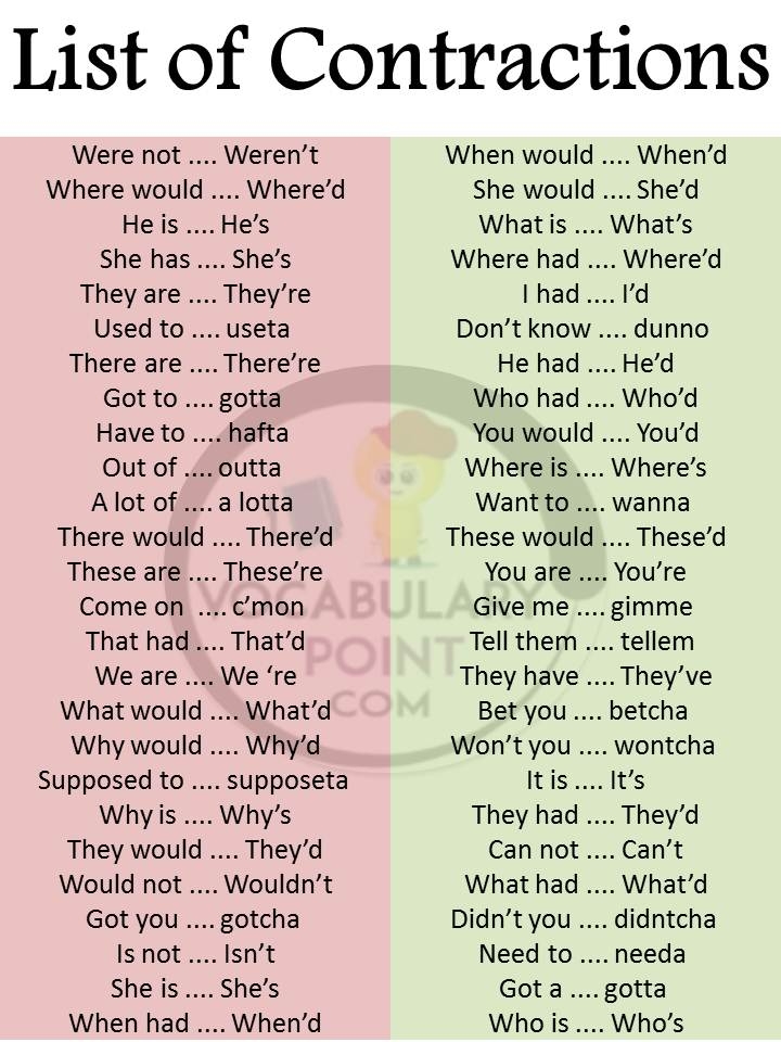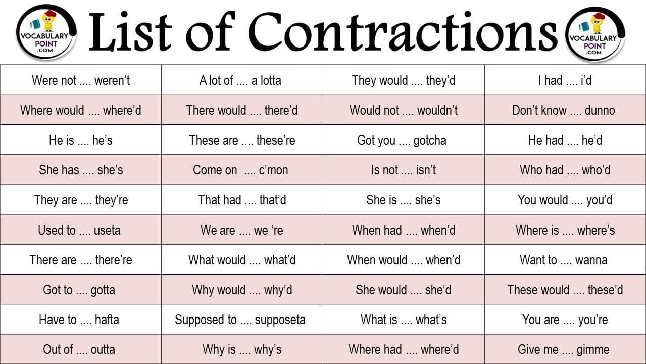 Below is a comprehensive list of contractions that you may come across in everyday conversations and texts: