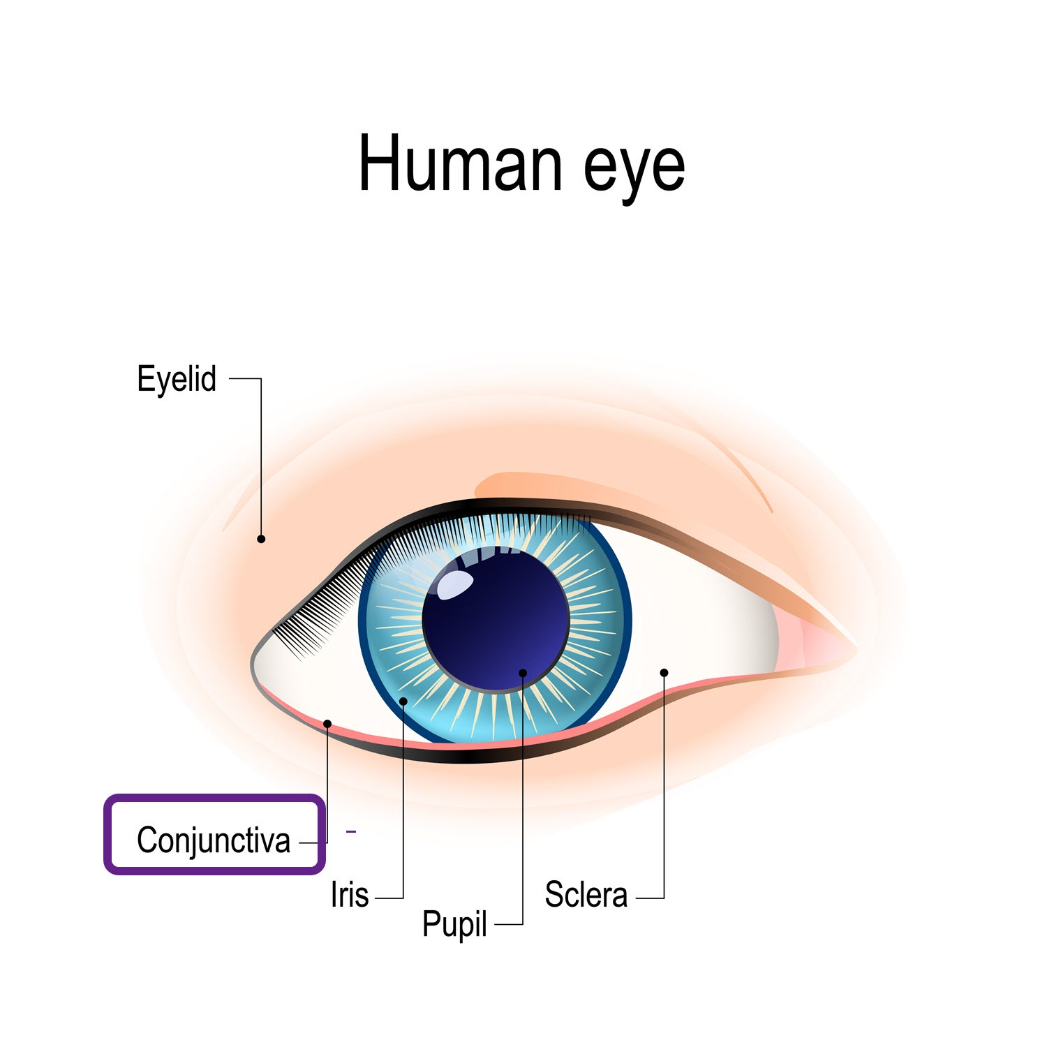 The conjunctiva is a thin, mucous membrane that covers the front surface of the eye and lines the inside of the eyelids. It consists of two parts: the bulbar conjunctiva, which covers the white part of the eye (sclera), and the palpebral conjunctiva, which lines the inside of the eyelids. This thin, transparent tissue helps to lubricate the eye, protect it from dust and other foreign particles, and provide a smooth surface for the eyelids to move over.