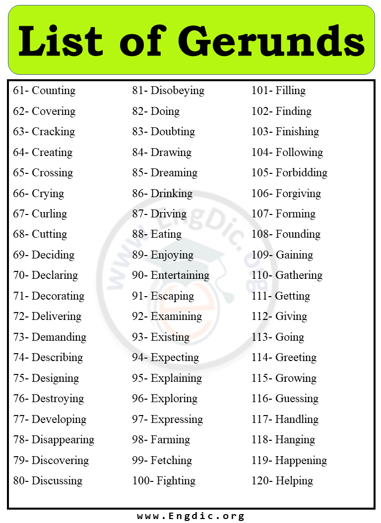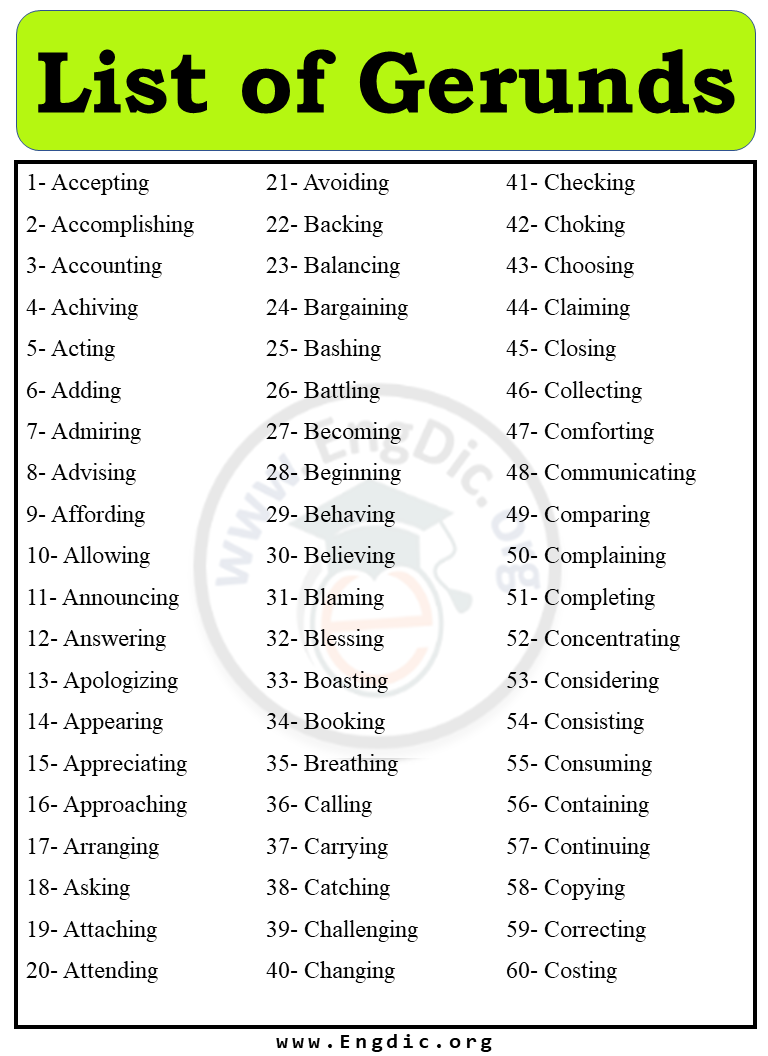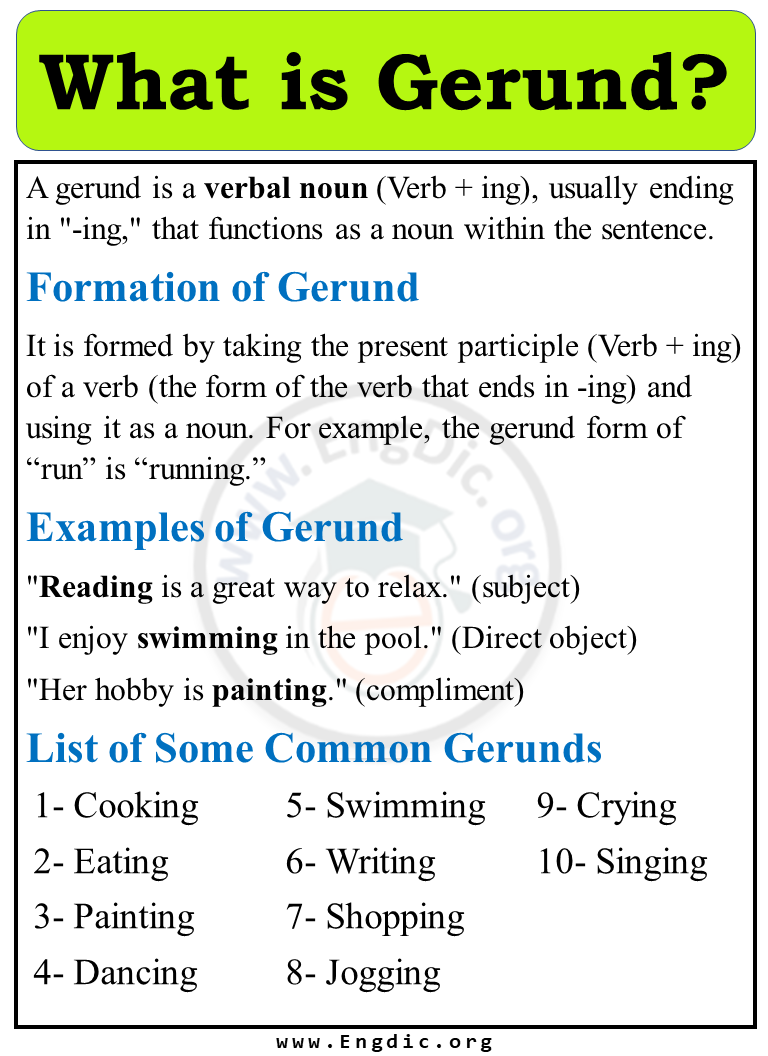 Object Gerunds: Object gerunds function as the object of a verb. For instance, “I enjoy dancing.” Here, “dancing” is the object gerund.