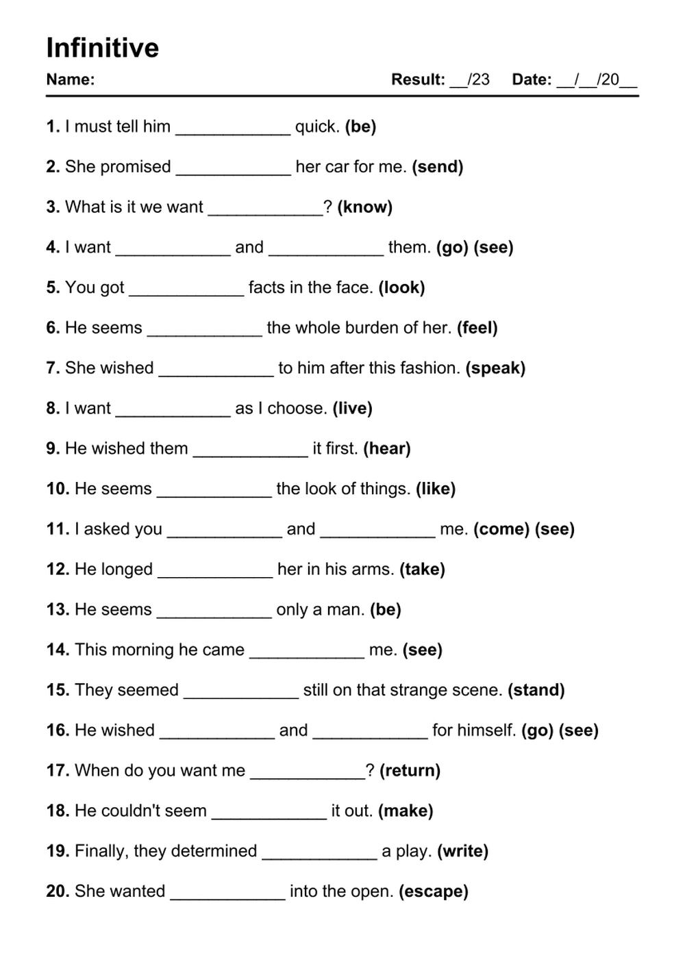 1. Fill in the Blank: Test your knowledge of infinitives by filling in the blank with the correct form of the verb. This exercise will help you practice conjugating verbs in their base form and reinforce your understanding of infinitives.