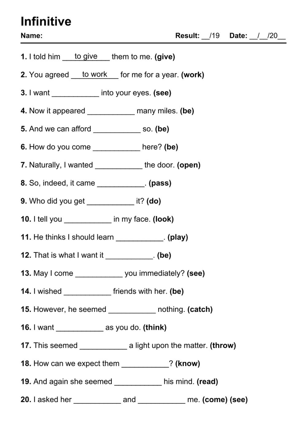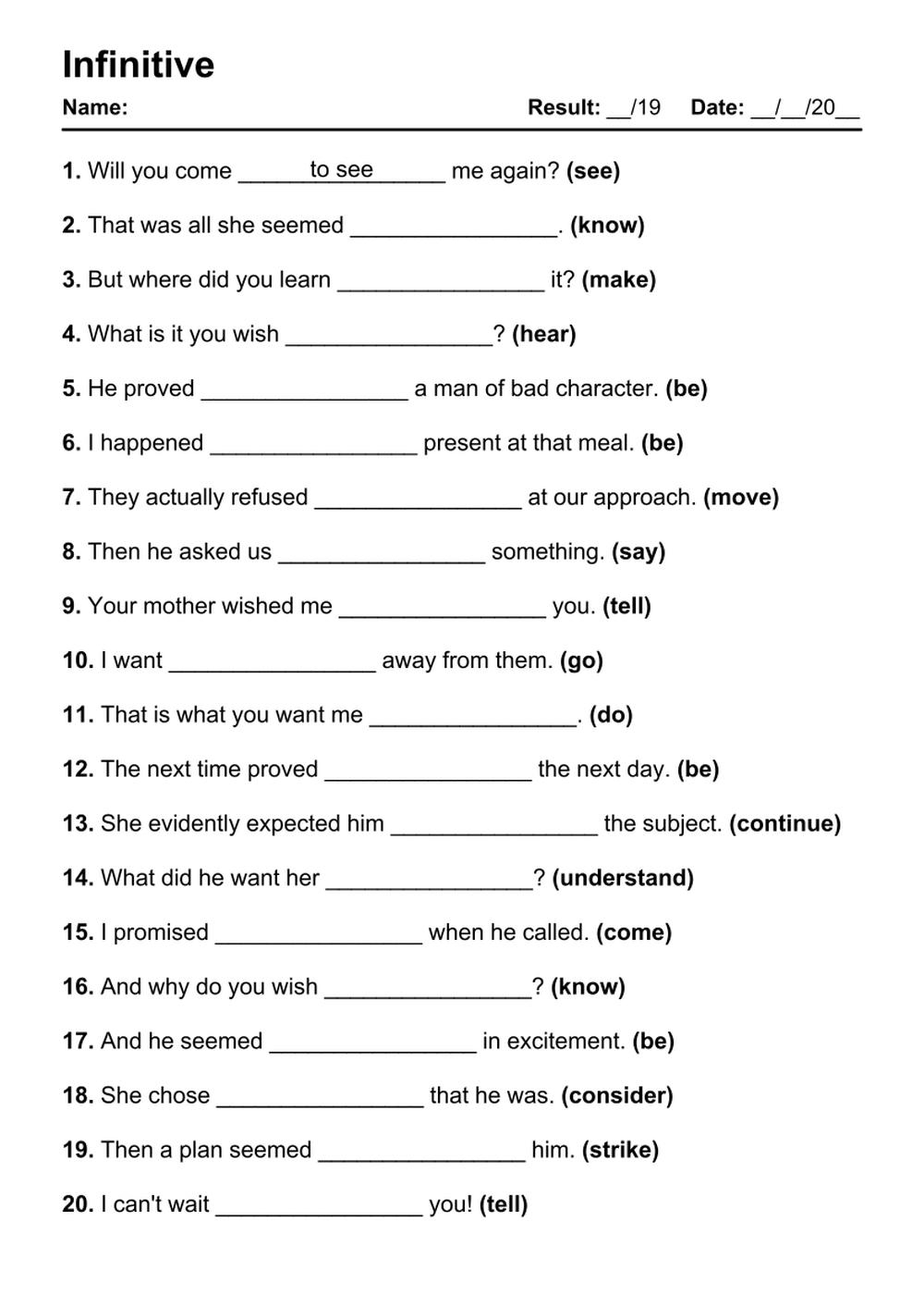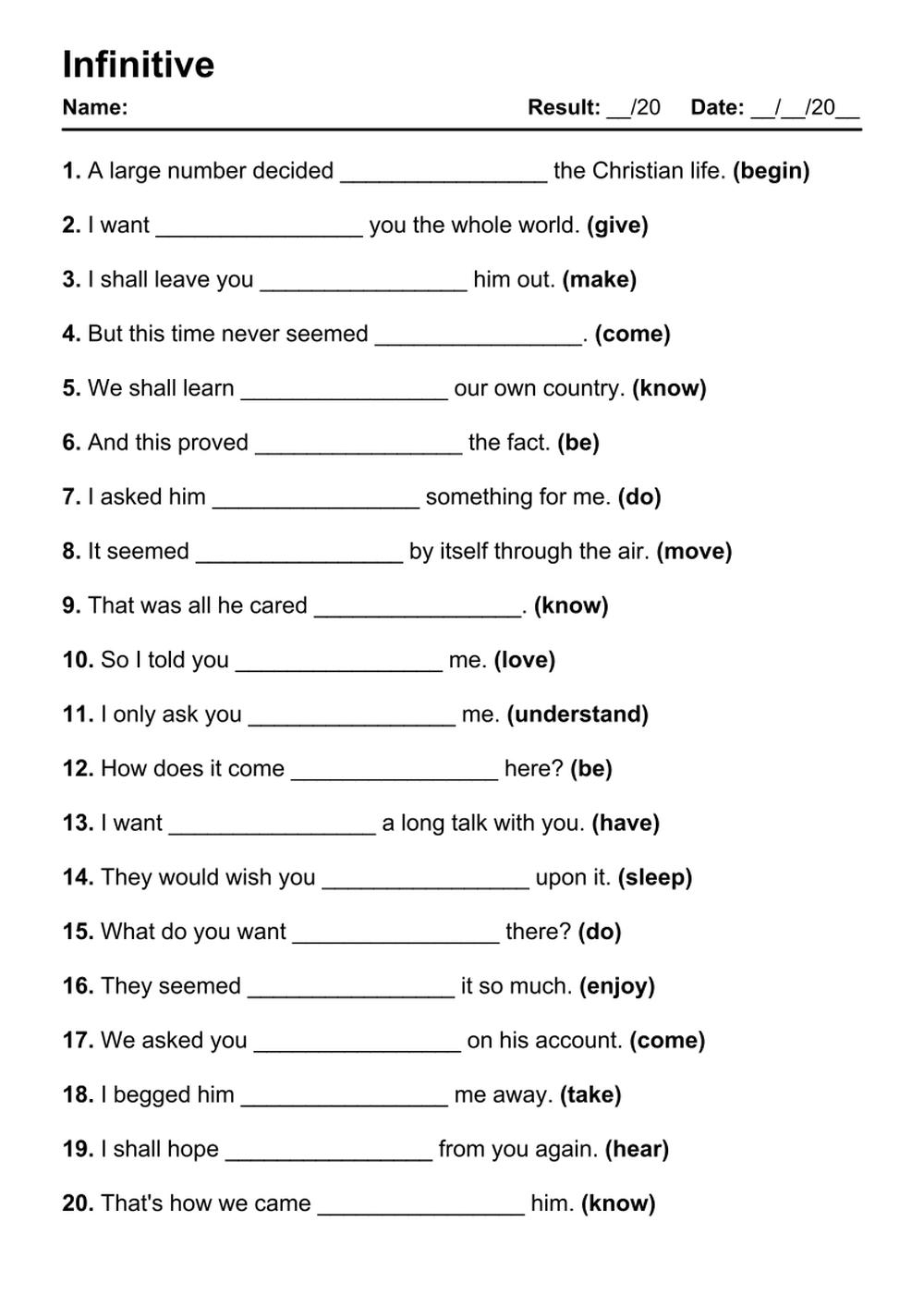 Whether you are a student looking to enhance your language skills or a teacher seeking resources for your classroom, free printable infinitive exercises are a valuable tool to supplement your learning. These exercises are designed to provide practice in identifying and using infinitives correctly, helping you gain confidence in your language abilities. With a variety of exercises available, you can tailor your practice to focus on specific areas of difficulty and track your progress over time.