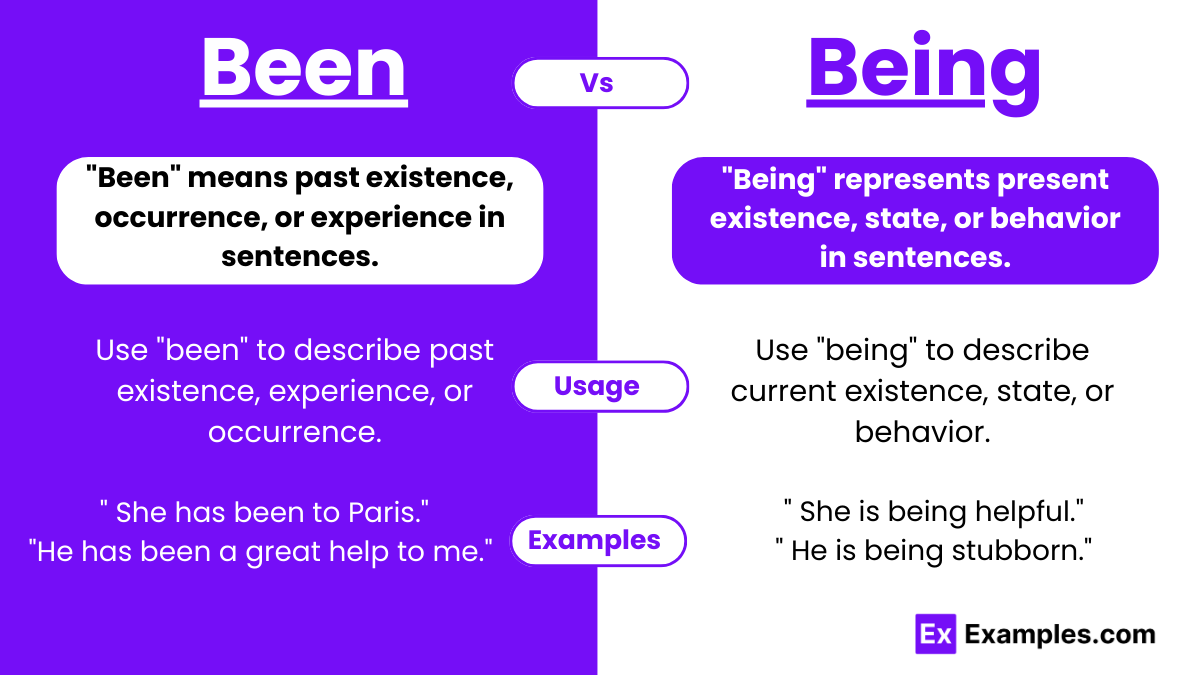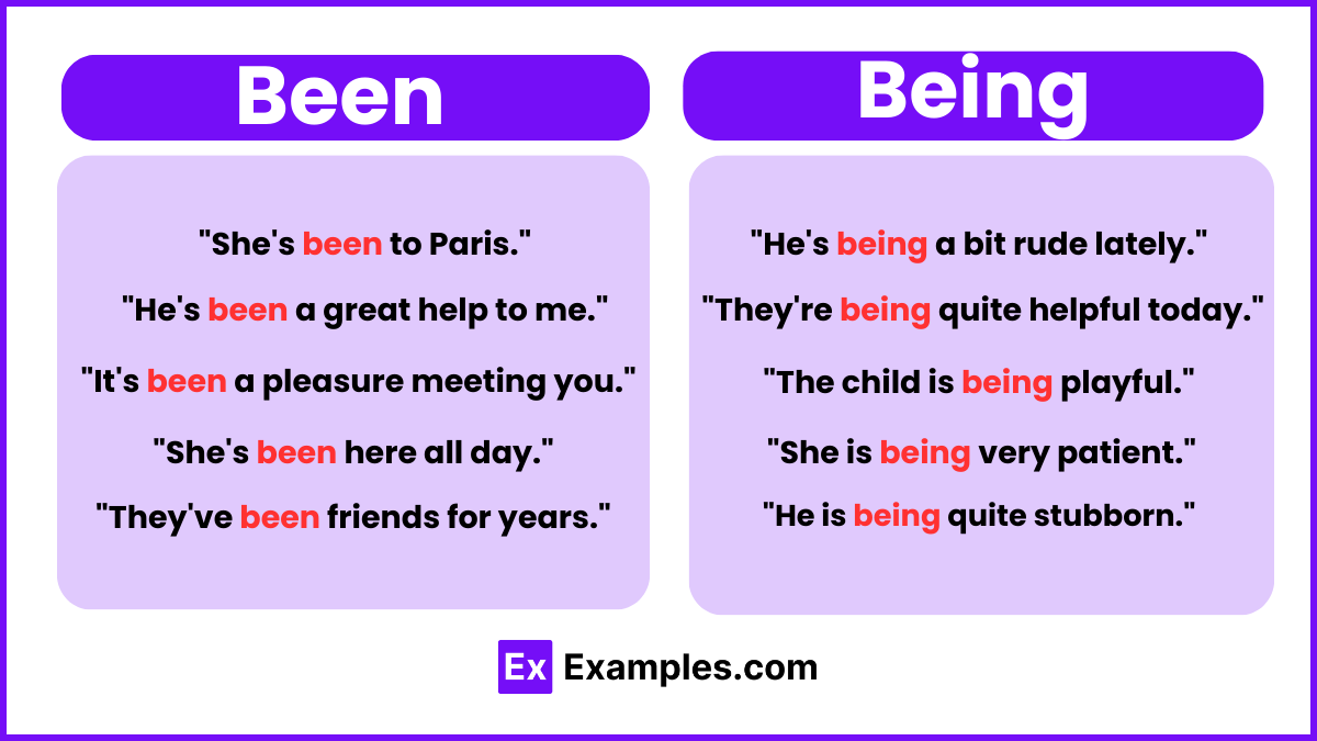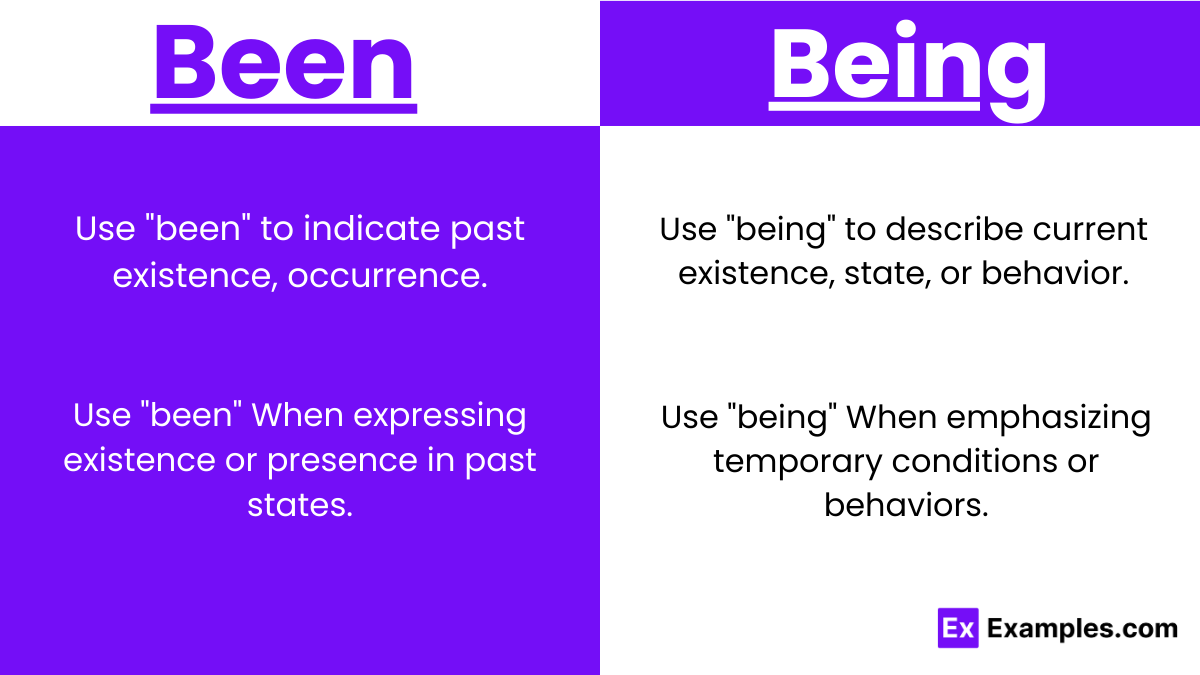 While “having been” is often used to indicate a completed action or state in the past, “being” is typically used to describe an ongoing or continuous action. Understanding how to use these phrases correctly can help you communicate more effectively in both spoken and written English.
