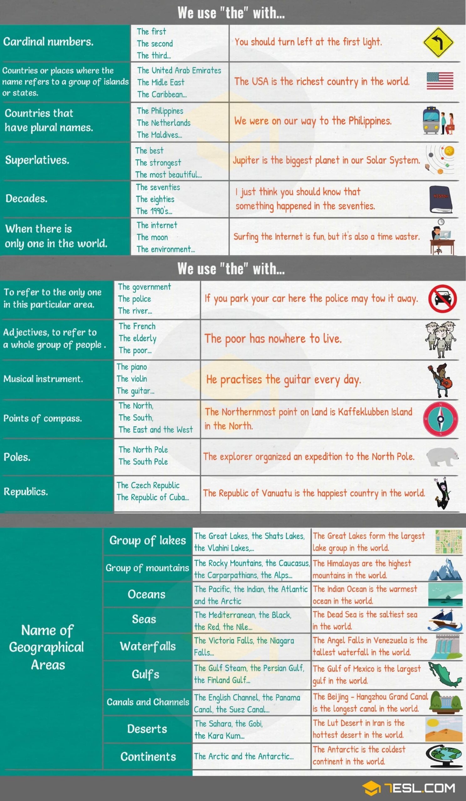1. The: This is the definite article and is used before singular and plural nouns when the noun is specific or already mentioned.