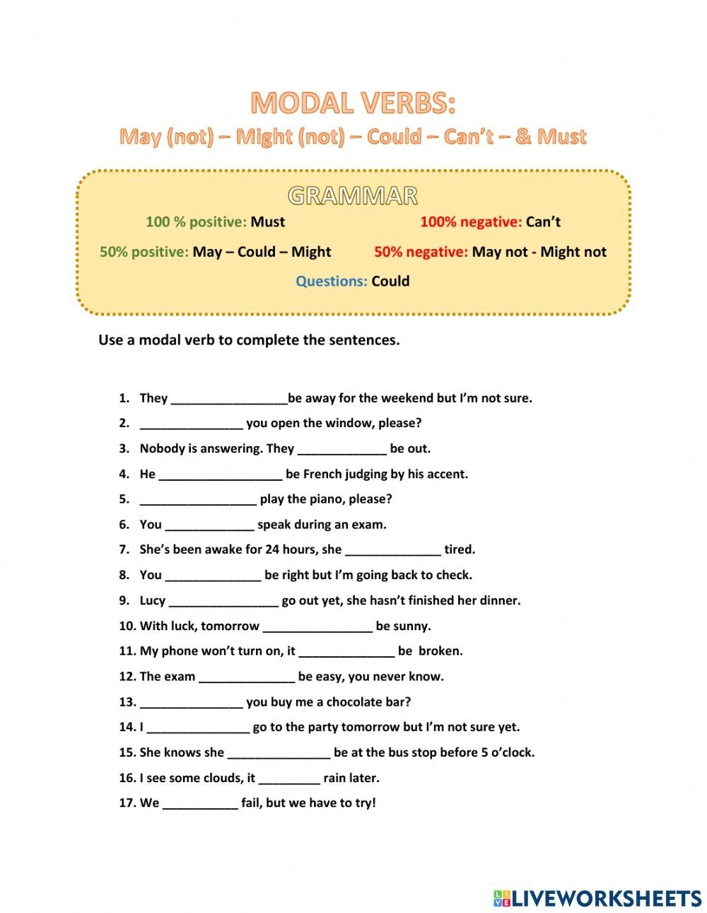 Overall, modal verbs exercises worksheets are an effective tool for students to practice and improve their understanding of modal verbs. By completing these exercises, students can enhance their grammar skills, expand their vocabulary, and become more confident in using modal verbs in everyday communication.