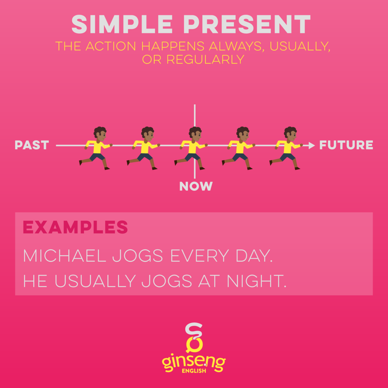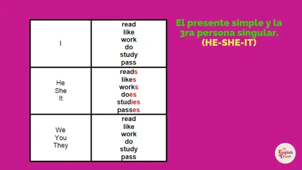 In the present simple tense, the verb remains the same for all subjects except for third-person singular subjects. For example, “I eat lunch at 12:00 every day,” but “She eats lunch at 12:00 every day.” The verb ‘eat’ changes to ‘eats’ for the third-person singular subject ‘she.’