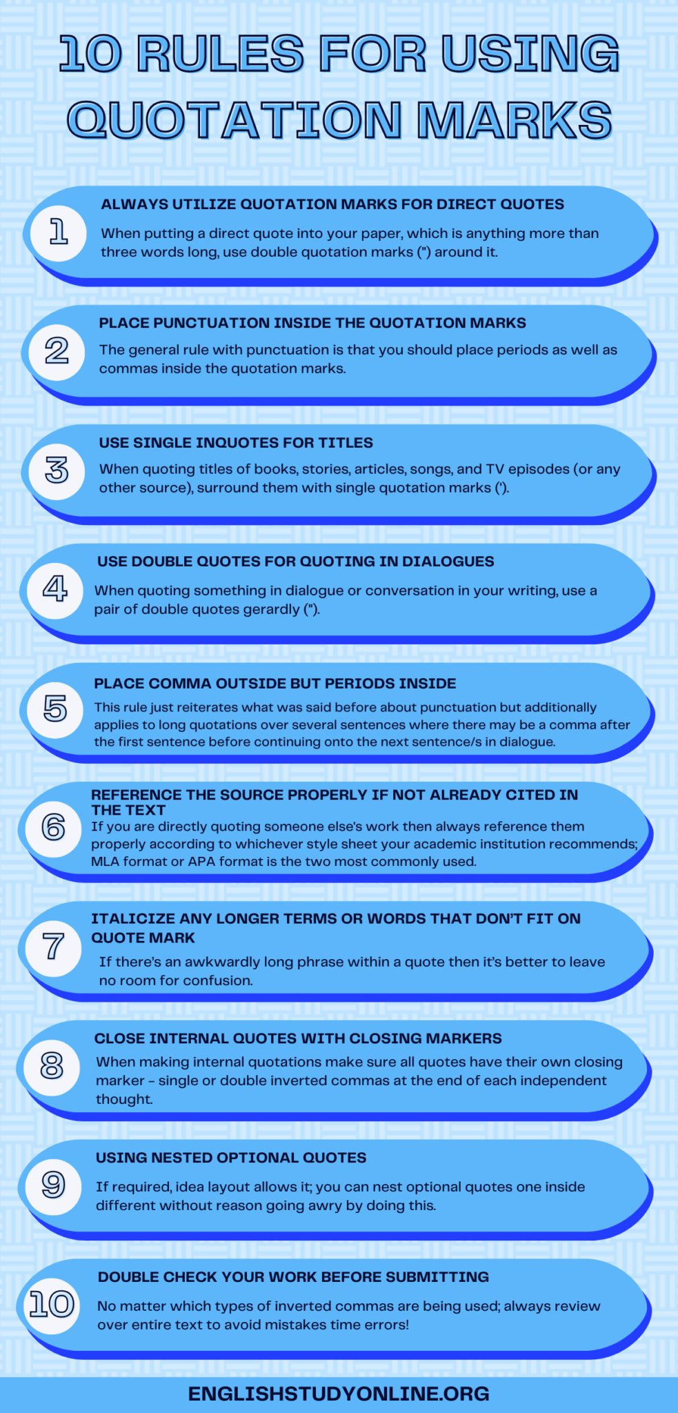 In conclusion, mastering the rules for using quotation marks is essential for any writer or communicator. By following these guidelines, you can ensure that your quotes are correctly attributed and enhance the overall quality of your writing. Practice using quotation marks in different contexts to become more comfortable with their usage and improve your writing skills.