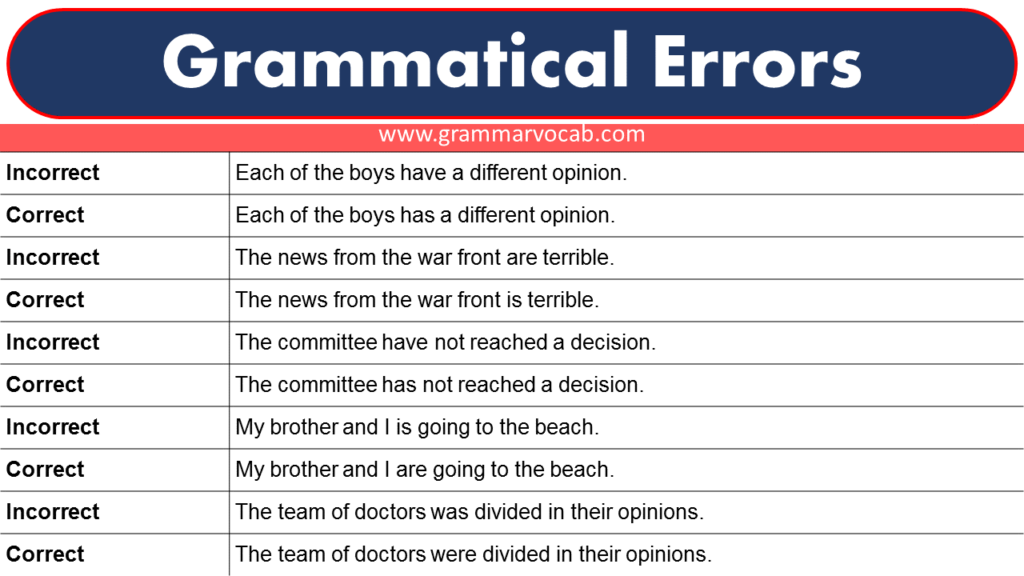 Additionally, the misuse of subject-verb agreement is a frequent error in grammar. For example, saying “The team is playing well” is correct, while saying “The team are playing well” is incorrect. Making sure that subjects and verbs agree in number is essential for clear and effective communication.