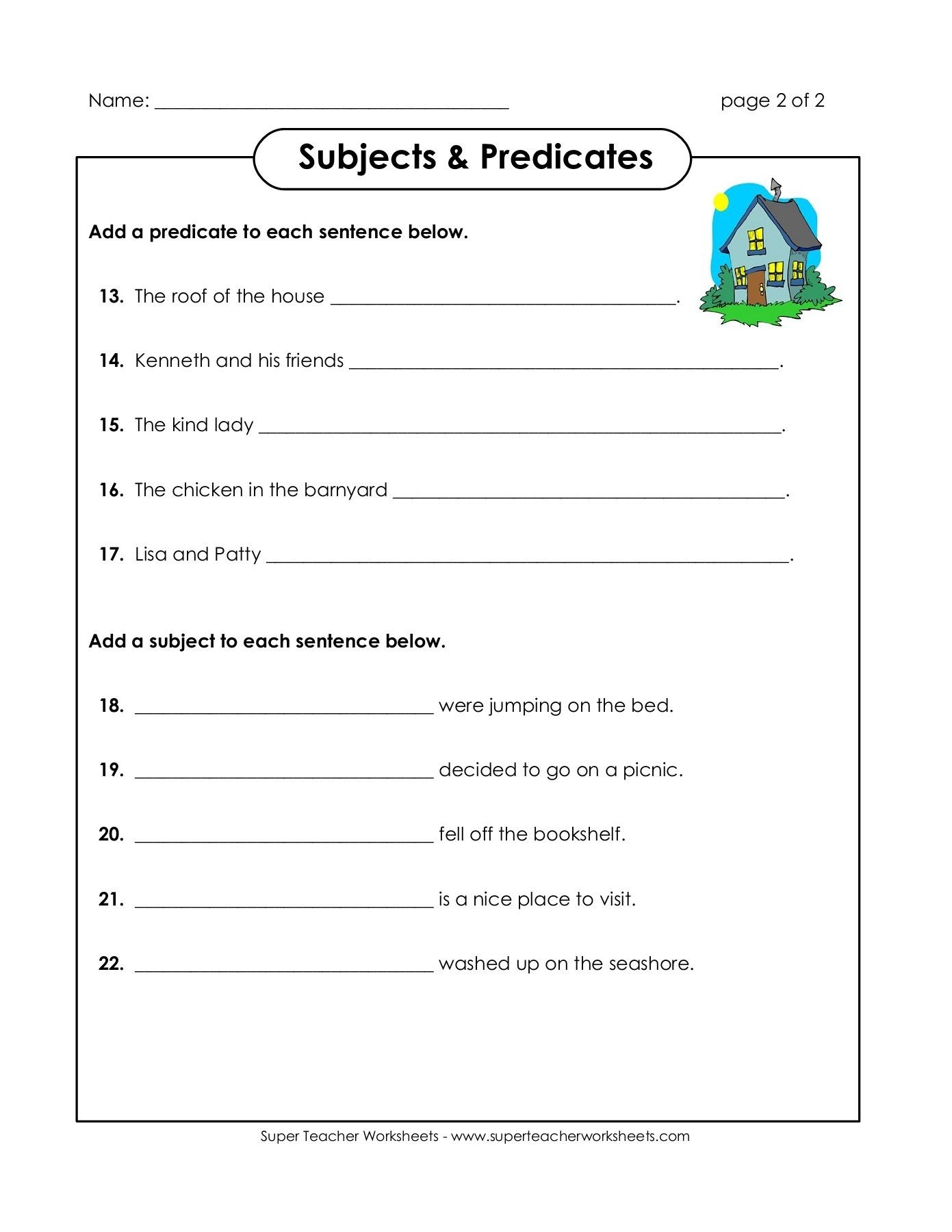 Subjects can be nouns, pronouns, or noun phrases that perform the action in a sentence or that the action is done to. Predicates, on the other hand, are verbs or verb phrases that express the action or state of being of the subject. In a worksheet, students may be asked to identify the subject and predicate in a given sentence, or to complete a sentence by adding the missing subject or predicate.