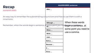 In conclusion, subordinating conjunctions are a key part of creating complex and varied sentences in English. By using mnemonic devices, practicing in context, and being patient with yourself, you can improve your ability to remember and use subordinating conjunctions effectively. With time and practice, you will become more comfortable incorporating these conjunctions into your writing and speaking, enhancing your overall language skills.