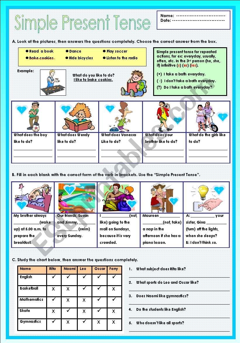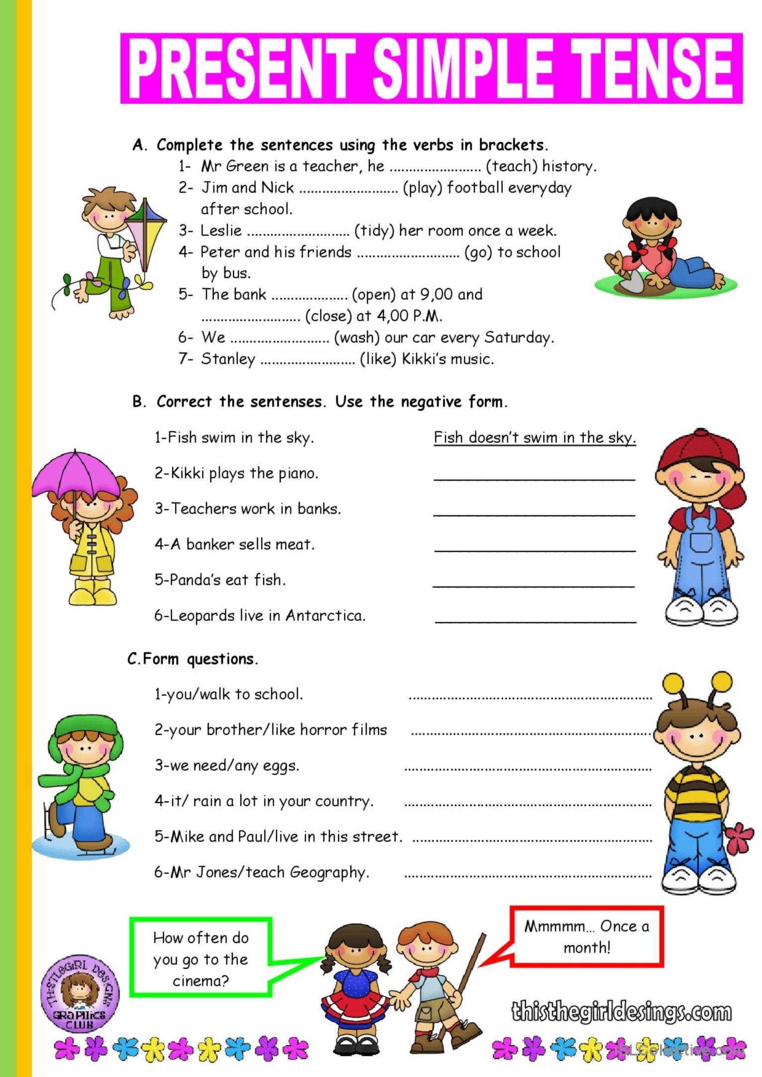 Another type of worksheet focuses on forming questions and negative statements in the present simple tense. Students are given prompts and asked to write questions or negative sentences using the correct verb forms. This helps students understand the structure of questions and negative statements in the present simple tense and reinforces their understanding of verb conjugation.
