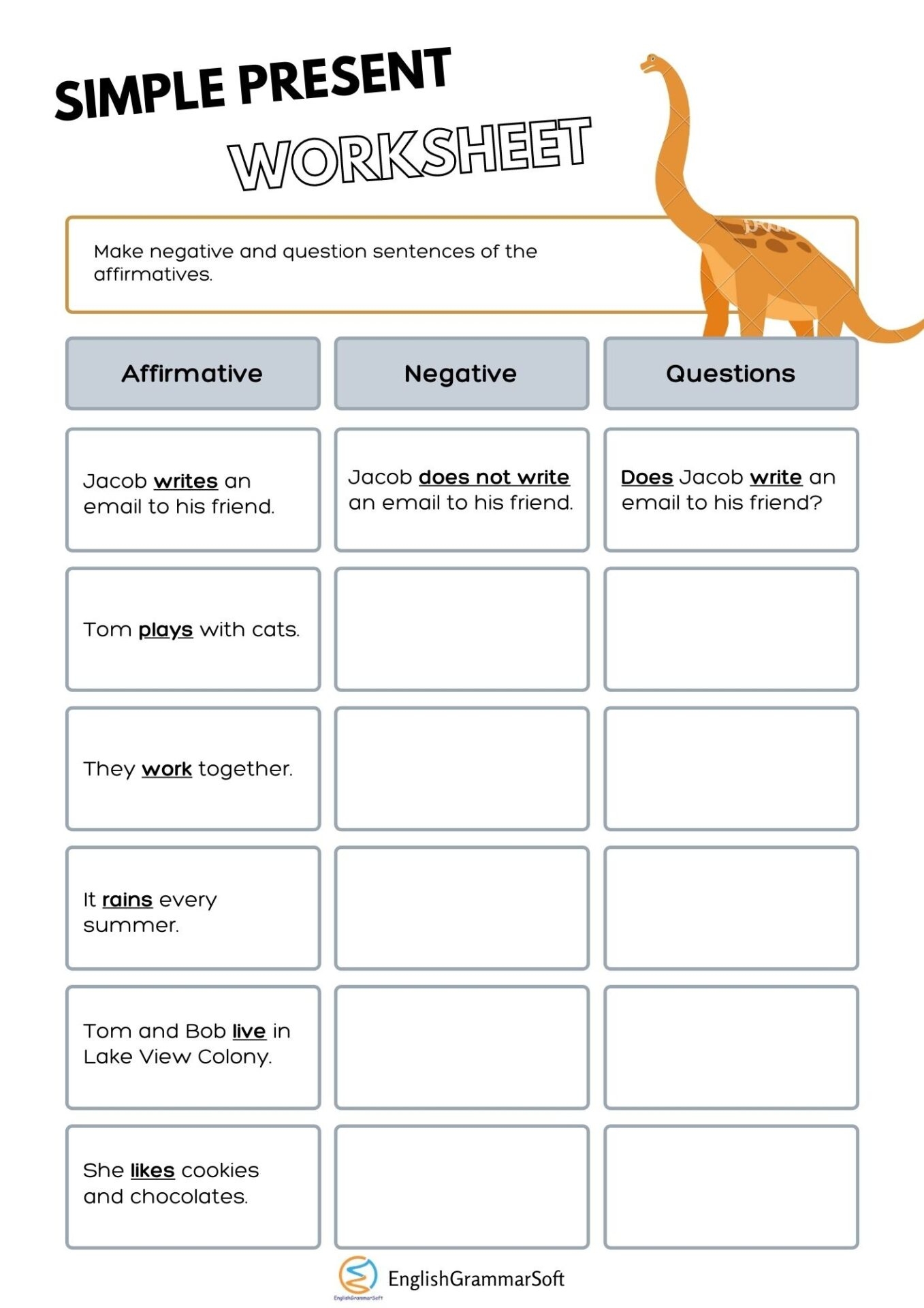 Worksheets for simple present tense typically include exercises such as filling in the blanks with the correct form of the verb, completing sentences with the appropriate verb tense, and forming questions and negative statements. These exercises help students understand the rules and usage of the simple present tense while also improving their grammar and vocabulary skills.